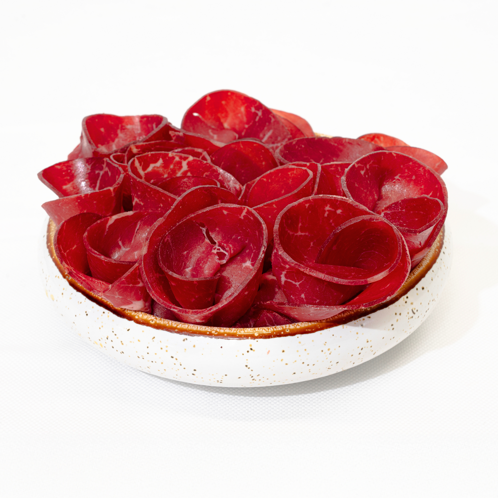 C'est tout simplement la meilleure Bresaola de bœuf. Produite à partir de morceaux de bœuf de qualité supérieure et d'épices rigoureusement sélectionnées.
